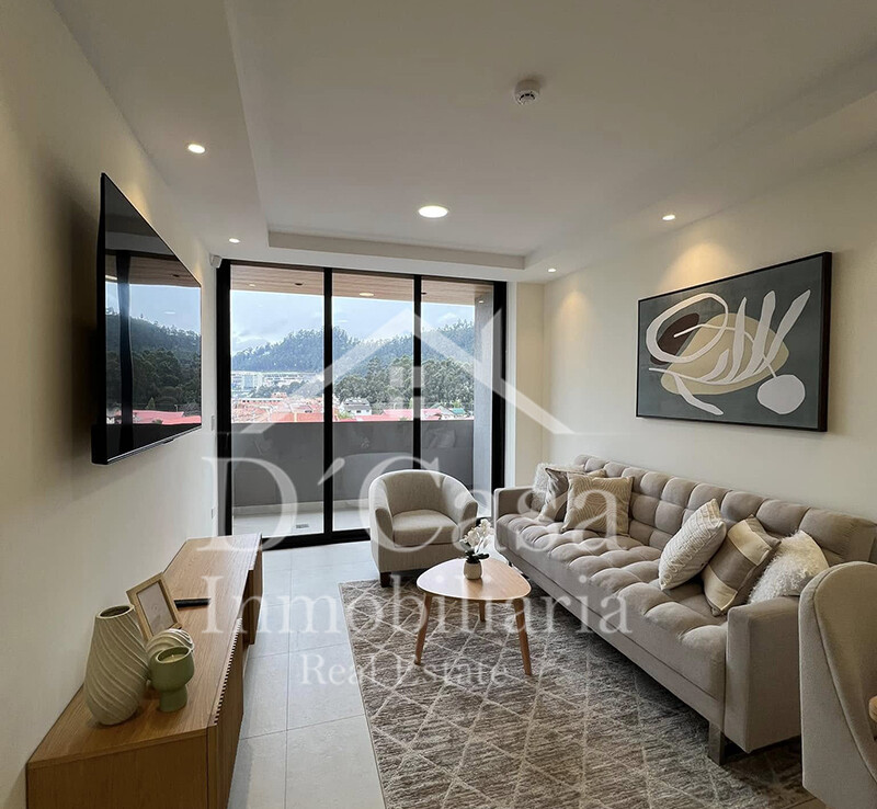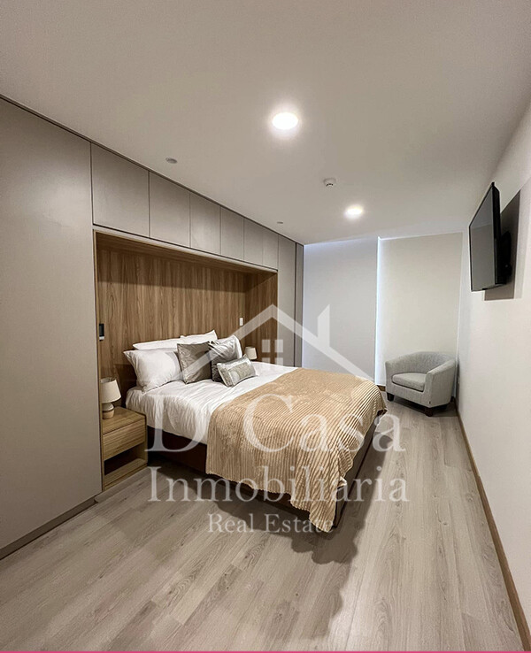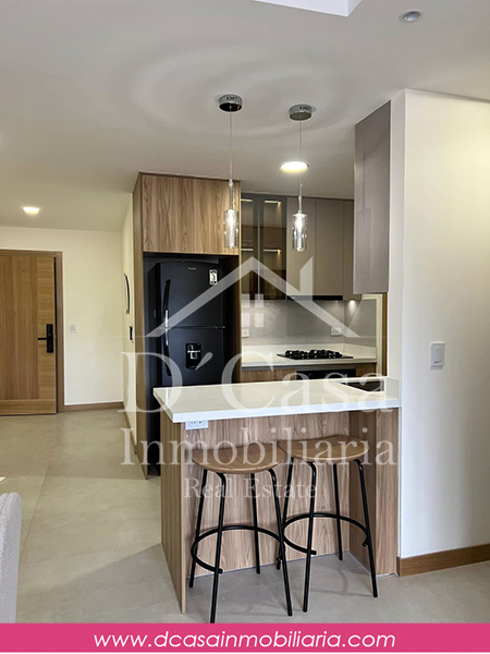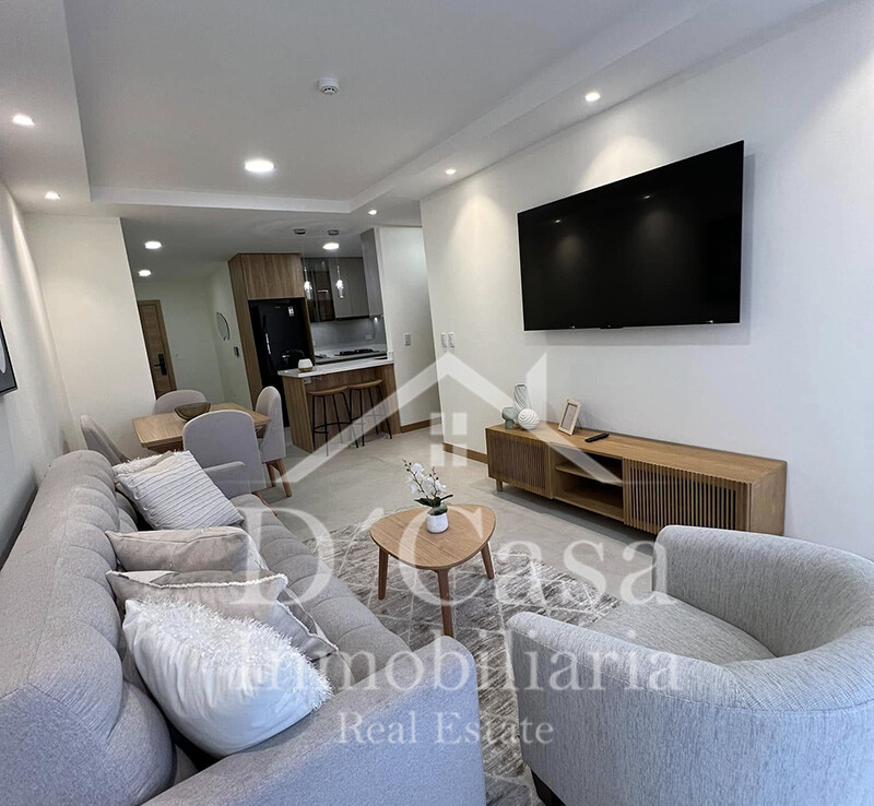 Sala, comedor, cocina, lavandería, desayunador, Dormitorio con closet empotrado en toda la pared cama Queen y TV de 45 pulgadas, sala con sofá cama y TV de 65 pulgadas, con línea blanca y utensilios balcón, 1 baño completo, 1 garaje, bodega y balcón